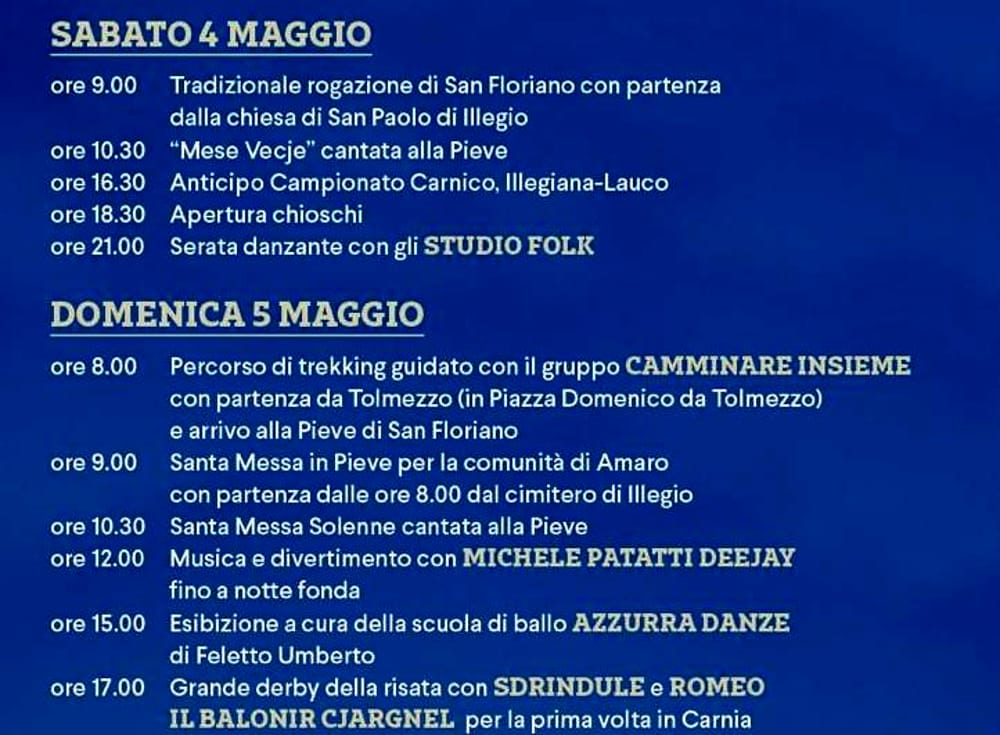 Il 4 e 5 maggio 2019 festa grande a Illegio di Tolmezzo, dove si festeggerà San Floriano, con un programma ricco di appuntamenti, sempre nel solco della tradizione