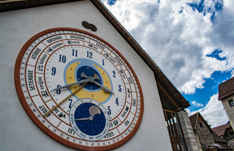 Nella foto: l'orologio-calendario perpetuo gigante di Pesariis di Prato Carnico (Val Pesarina, Carnia, Udine, Friuli-Venezia Giulia), situato tra la ex scuola elementare, ora residenza turistica, e l'ex edificio Cral.